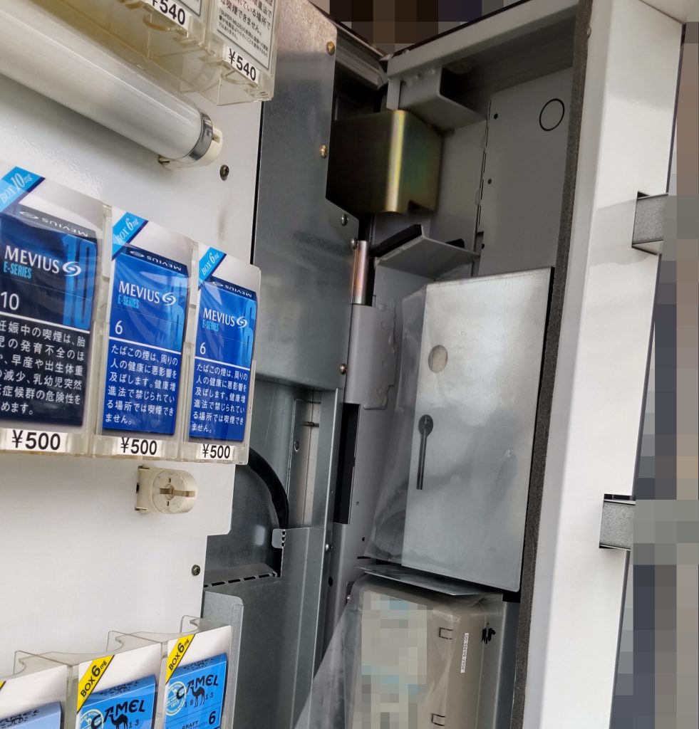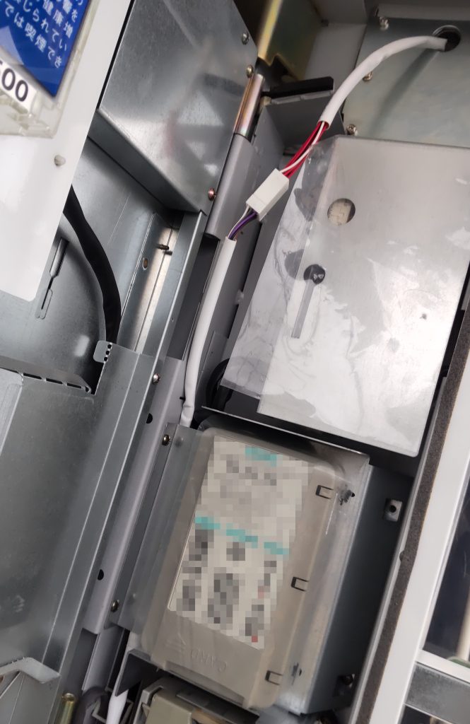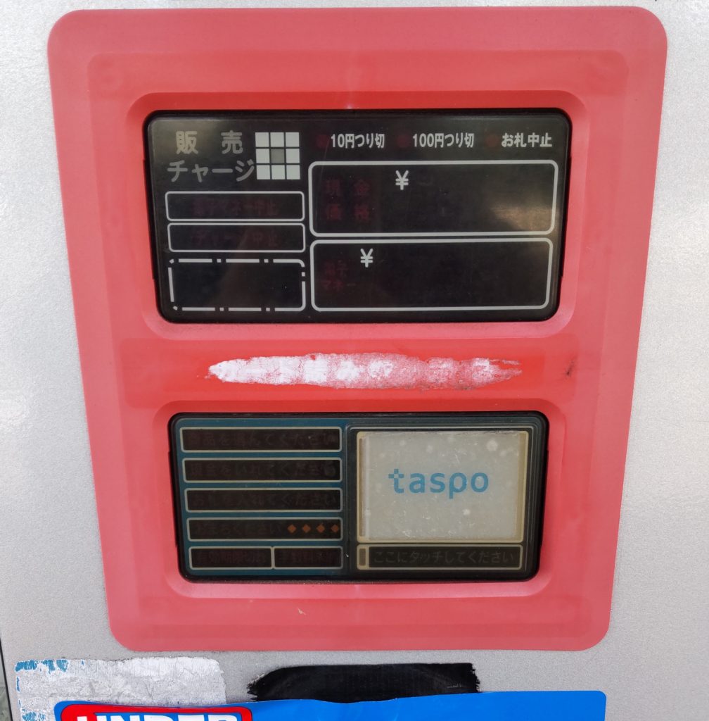 EXCを購入する時は自販機のメーカーや種類に注意が必要で、機種やtaspoの形式によって取り付けに必要なハーネスが異なる。購入前に自販機の型番などを販売店に伝え、取り付け可否を確認しよう。私の場合、taspo表面が以下のクボタ製自販機だ。