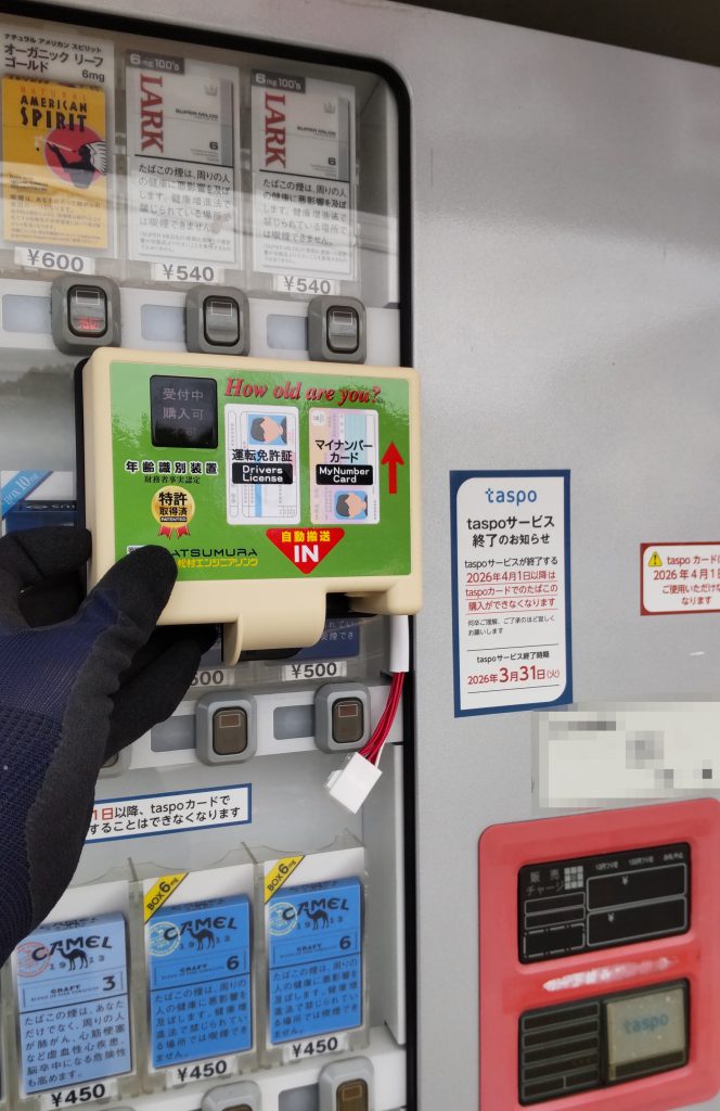 taspo(タスポ)が設置されている自販機が使えなくなってしまう。自販機がまだ使える状態であってもtaspo(タスポ)が使えなければ自販機が稼働しないため、今後は運転免許証やマイナンバーカードなどを利用した新しい年齢識別装置への切り替えが必要となる。