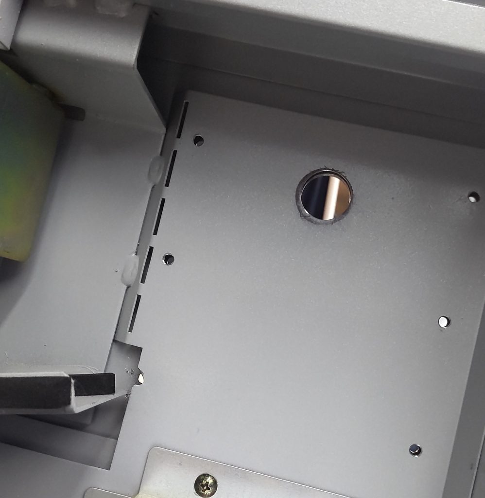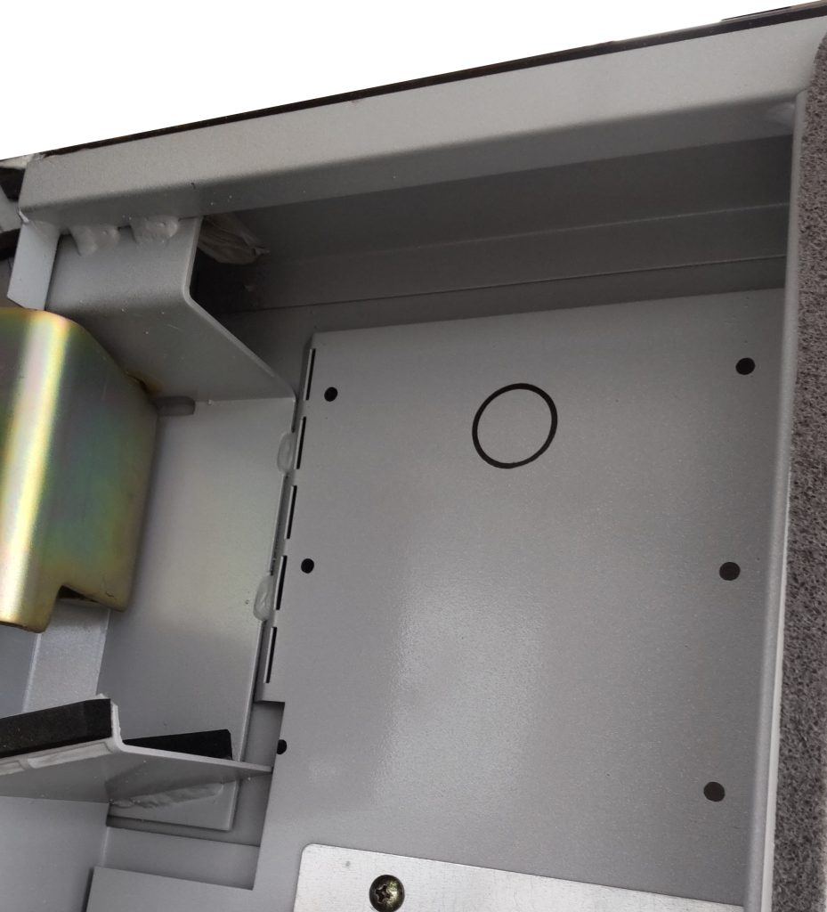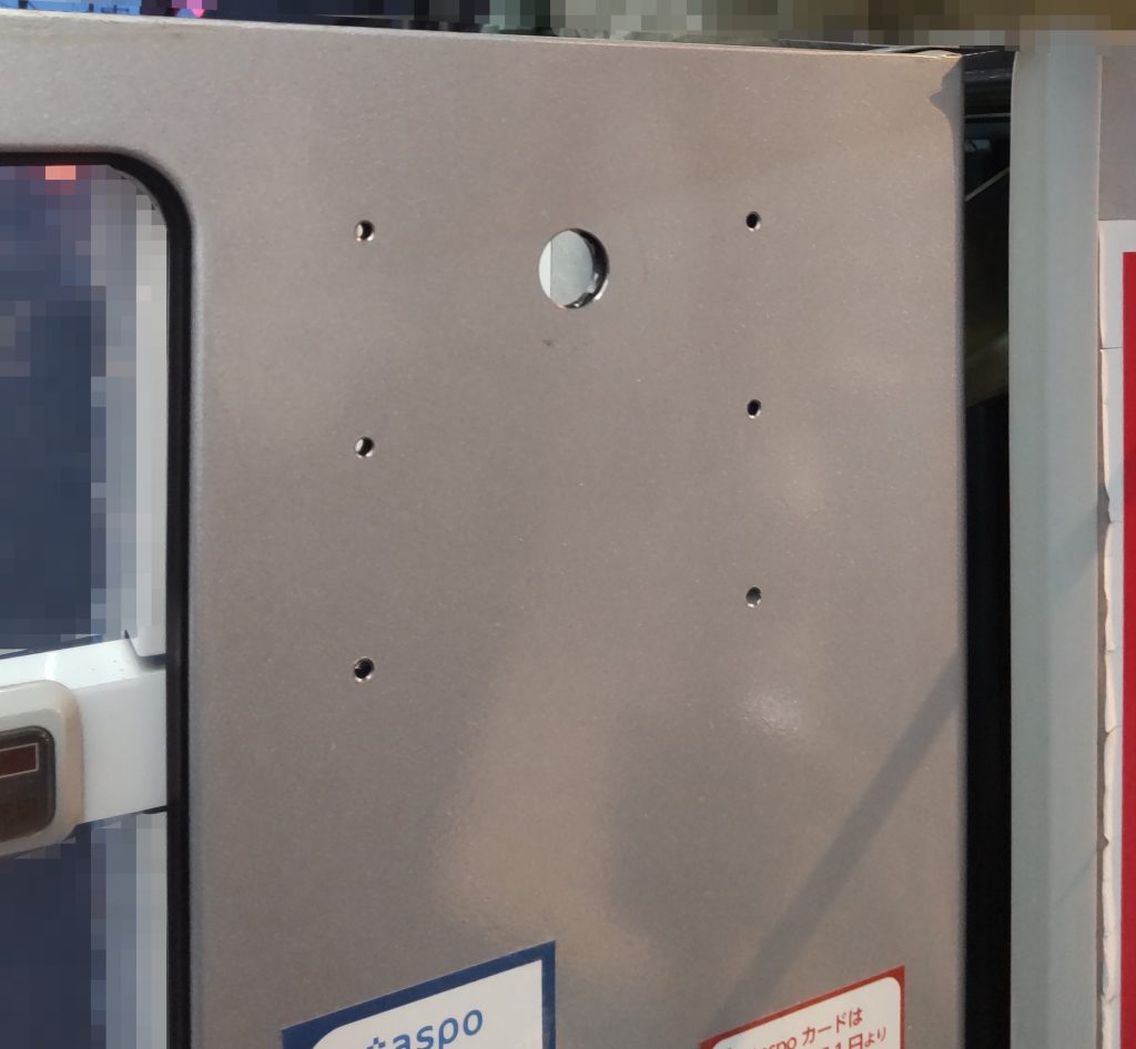 ダミーのあるアクリルだと穴もあけやすく、位置も比較的自由だったが、自販機右上にスペースがあるので販売スペースが潰れてしまうのを避ける意味でもこちらに決めた。金属のため穴あけには少々固い。