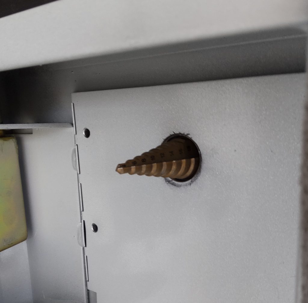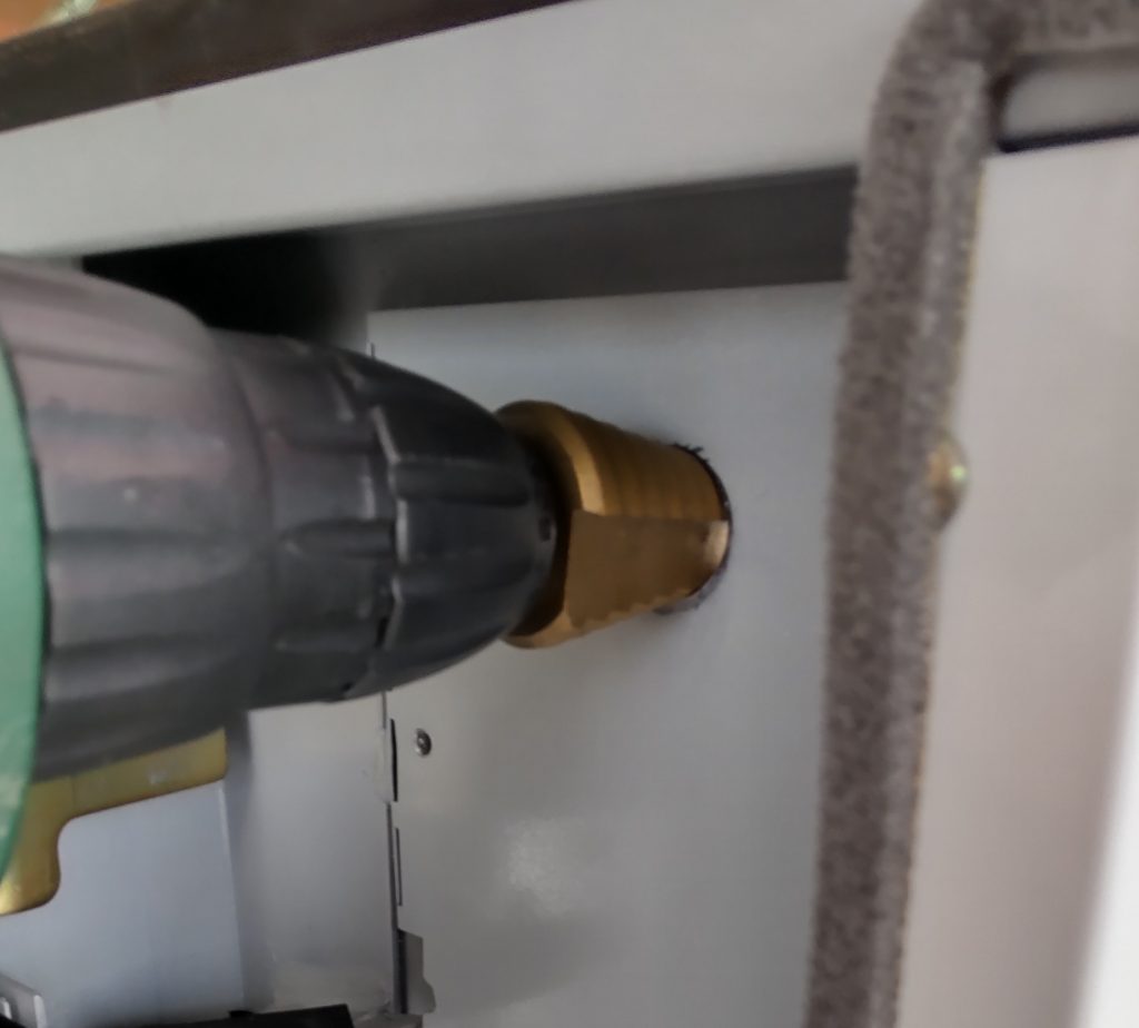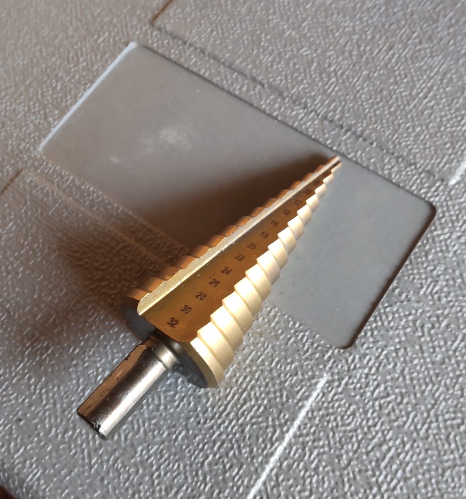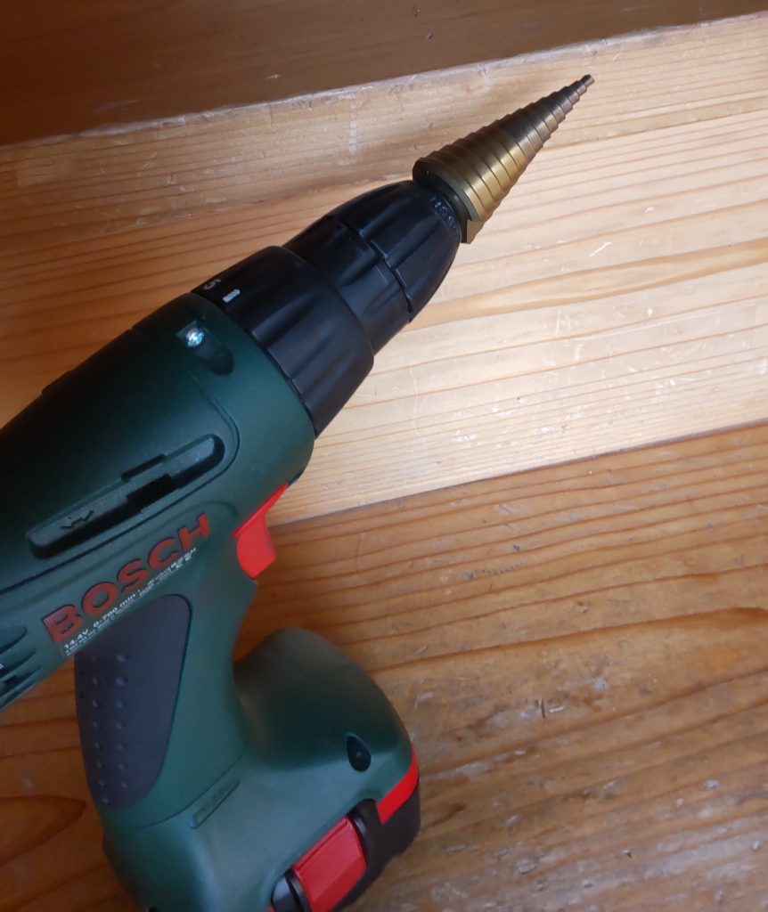 私の手持ち工具はあまり充実していないため、かねてより、ステップドリルあったら便利だなと何度も思うことがあったので汎用性のあるステップドリルを購入していたこともあり、ここでも活躍。4mm~32mmまで対応しているので、私のDIY範囲など余裕でまかなえる。