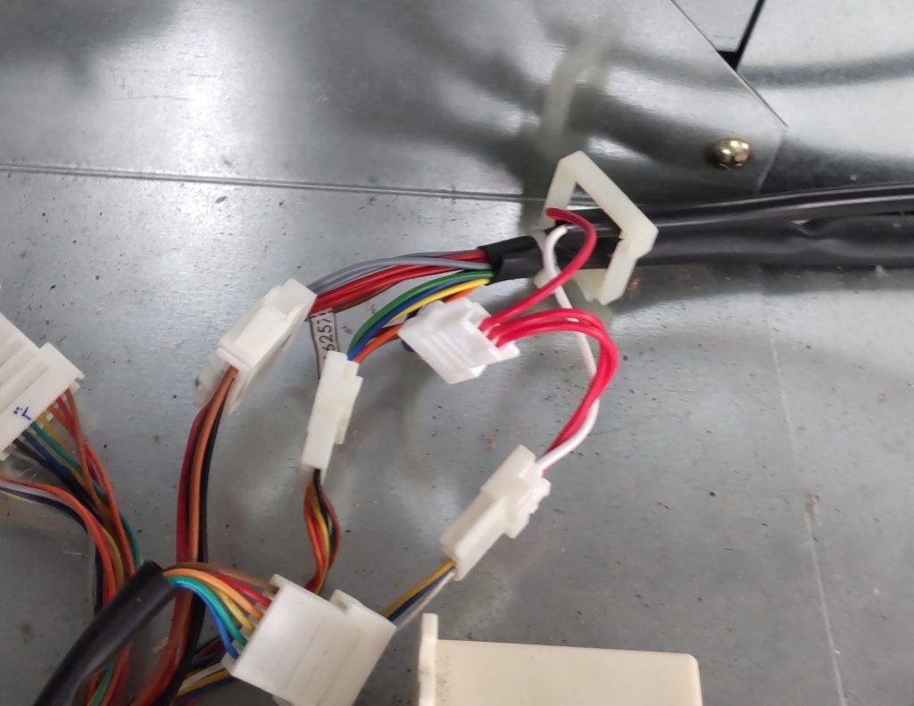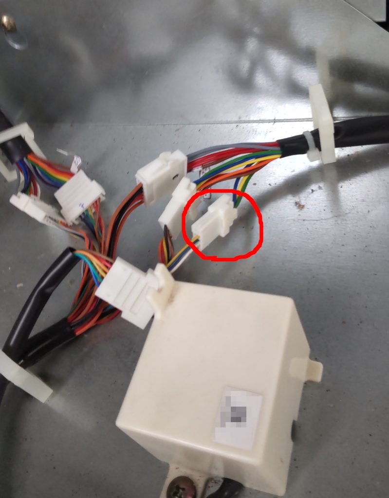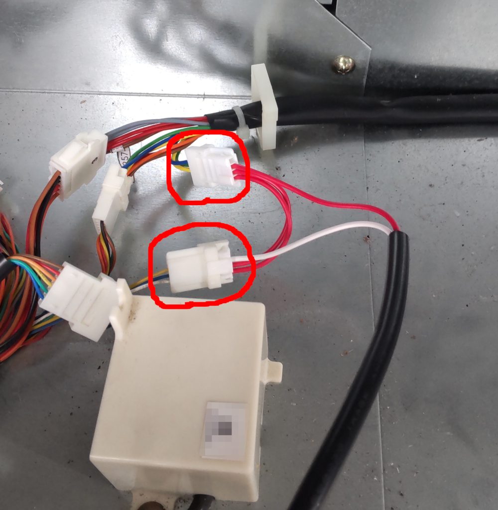 このあたりに専用ハーネスのコインメックに接続する部分がくるように長さを調整する。線がゴチャついて煩雑に見えるが要は、カプラを接続すればよい。