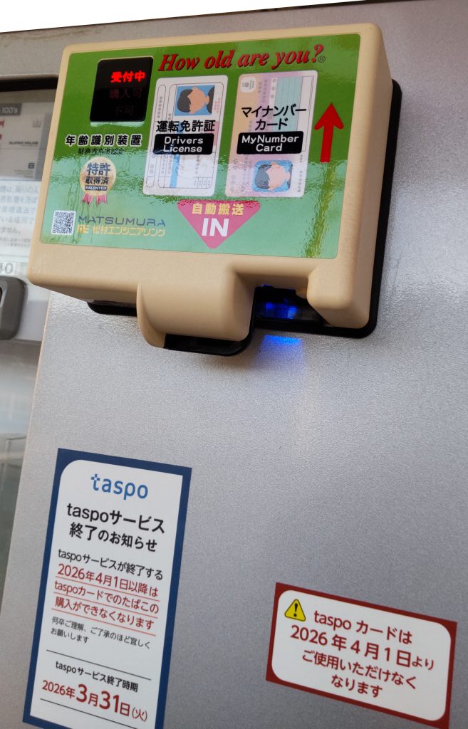 通信回線のサービス終了に伴い、年齢確認(成人識別)のICカードであるtaspo(タスポ)が2026年3月末でサービスを終了することが決定しているのだ。